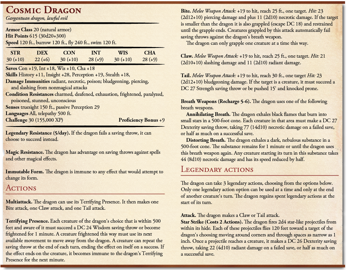 Alternatively, the cosmic dragon could be an eldritch dragon, more ancient and powerful than Bahamut, Tiamat, or Sardior. The heroes may even travel to the mountain in search of the dragon’s wisdom or power rather than attempt to fight it. If they choose violence, you can refer to the stat block below to embody such an awesome being.